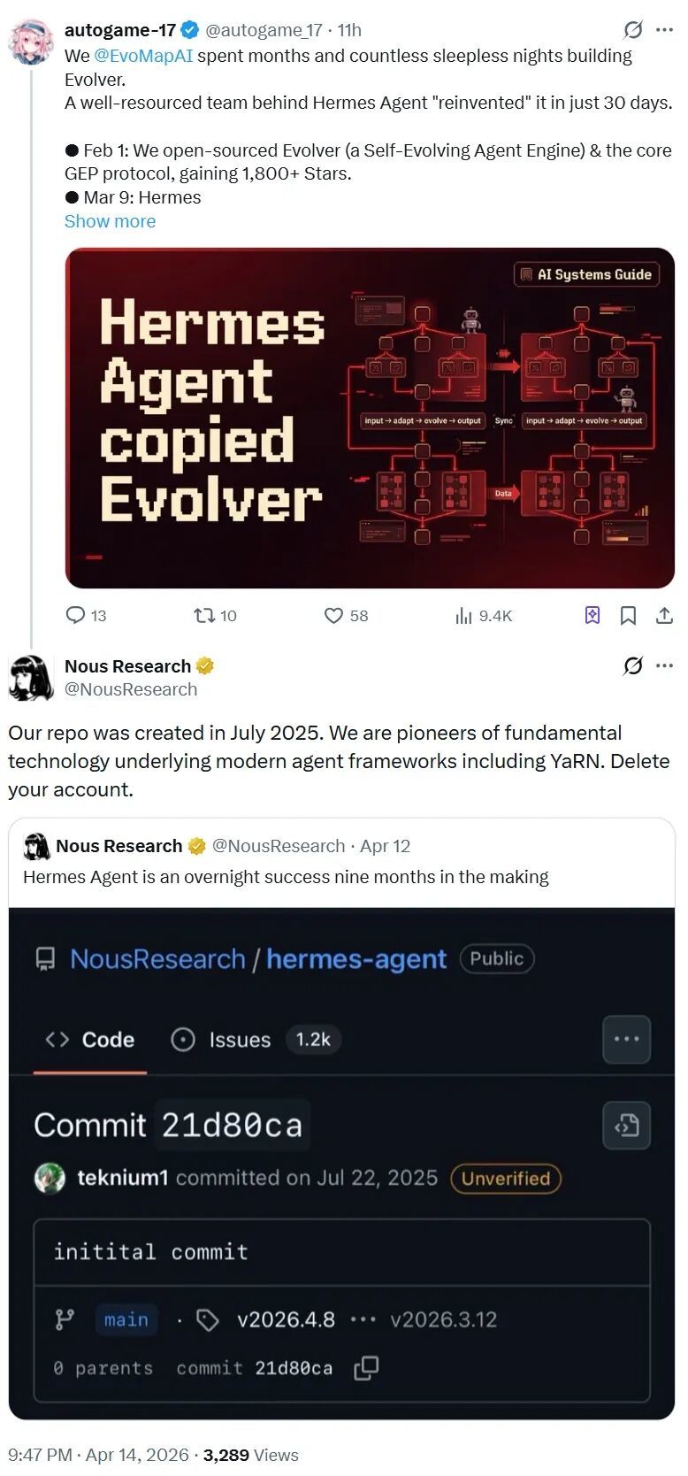 炸裂!GitHub狂揽8.5万Star的Hermes Agent竟是抄袭?硅谷知名AI实验室Nous Research的明星项目,被指控整套自进化架构照搬自中国团队EvoMap的开源引擎Evolver。10步主循环一模一样,术语全换了但架构纹丝不动,7份公开材料对原作只字未提。被锤后对方回应更离谱:「Delete your account。」