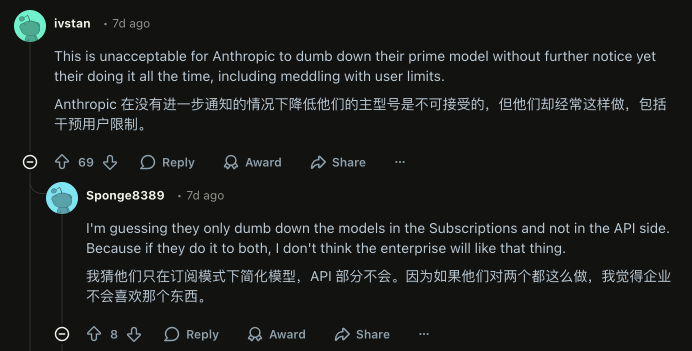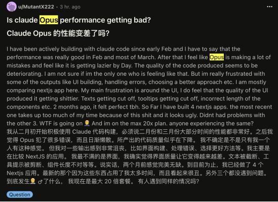 但很快,在Reddit的Claude社区里,类似的反馈开始密集出现,而且描述高度一致: