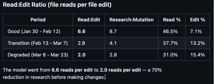 相比之下,报告里更有说服力的,其实是那些行为层面的变化。比如read:edit(读取代码vs修改代码)的比例,从6.6下降到了2.0;3月8日之后,被stop hook捕捉到的违规行为有173次,而之前是0。