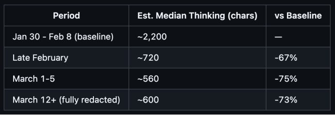 真正让讨论升级的是这个数字:有人在Claude Code的使用过程中,对历史交互日志进行对比,发现模型在复杂任务中的推理过程明显缩短,自2月更新以来,推理深度下降了67%。