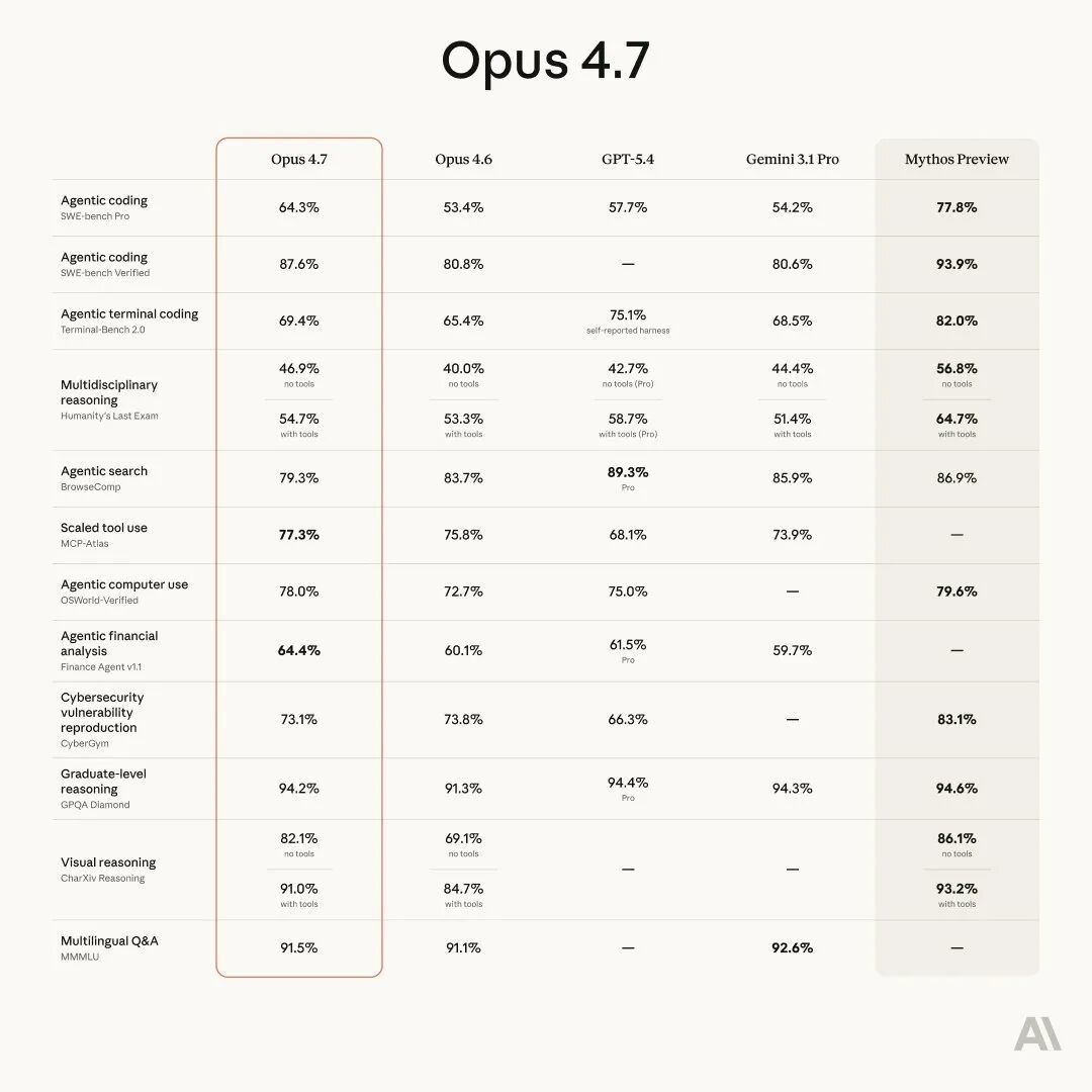 值得一提的是,Opus 4.7并非Anthropic手中的最强底牌。从基准测试来看,虽然新模型Opus 4.7在编程等方面已经超过市面上其他竞争对手,但都比不过Claude Mythos Preview。