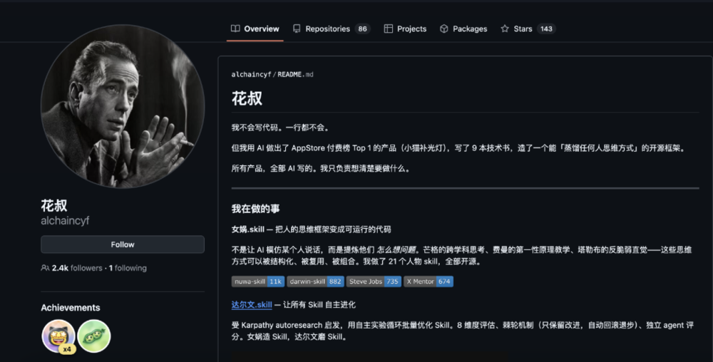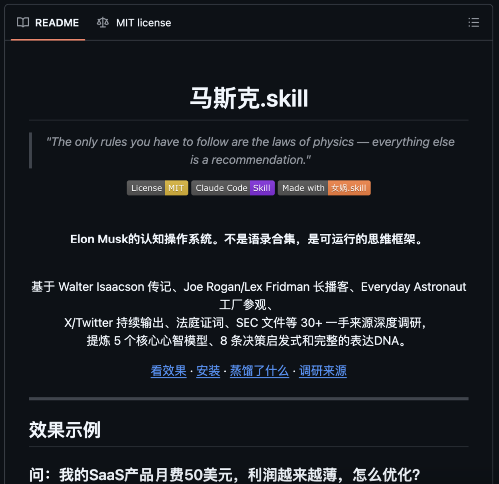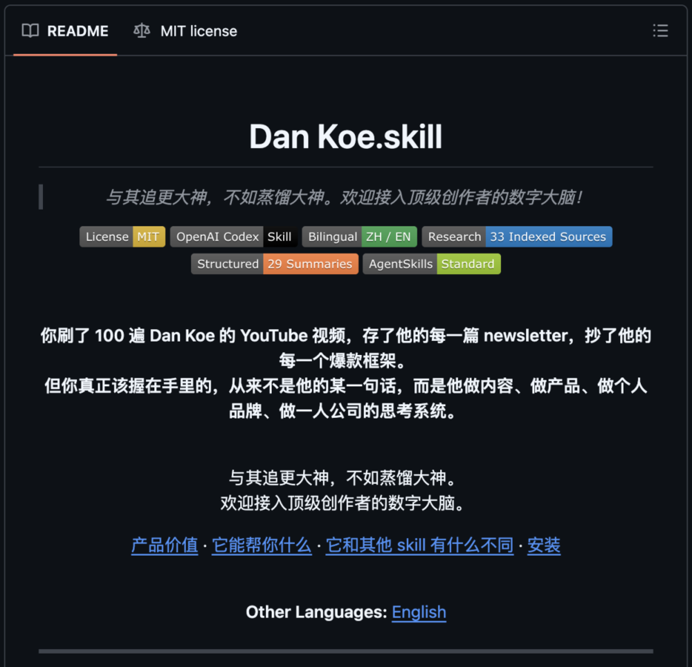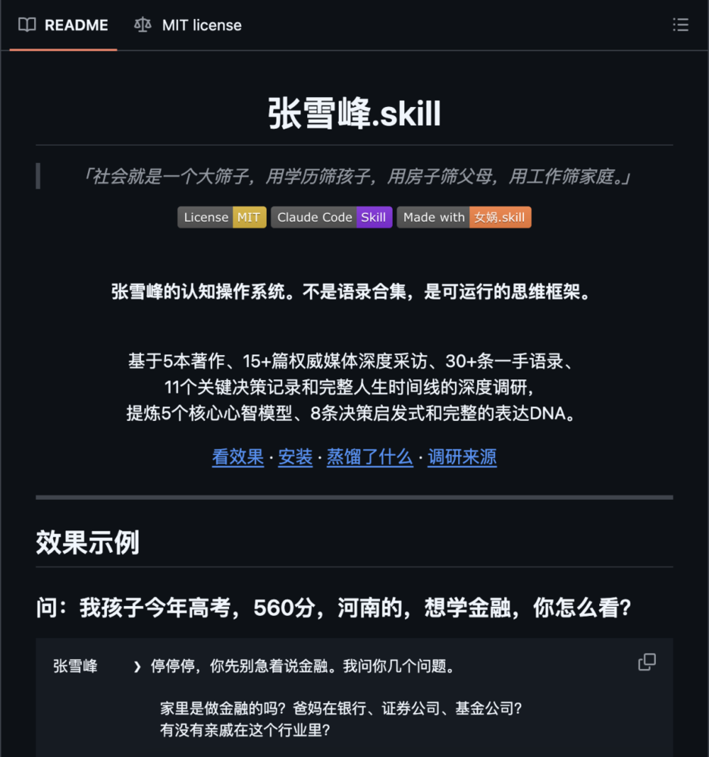 那里已经有人做了峰哥、罗翔、Dan Koe,各种各样的skill项目,README写得煞有介事,有的还附上了效果演示。