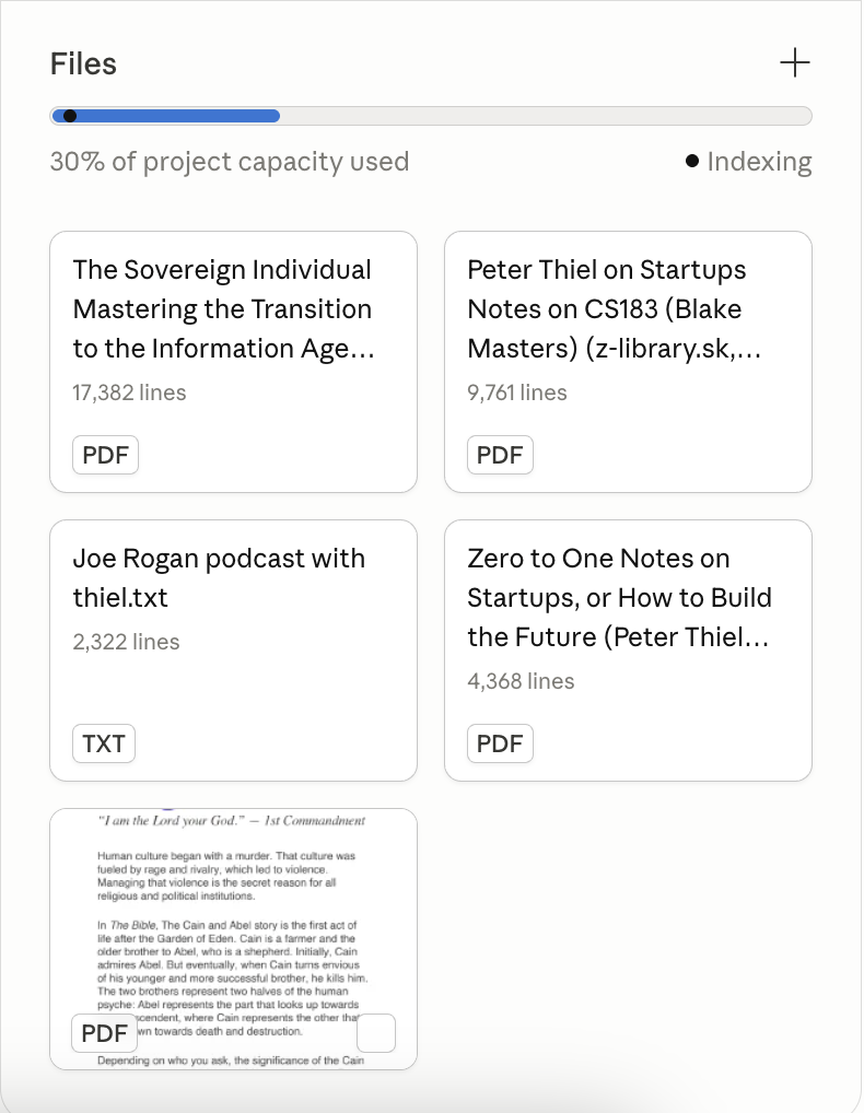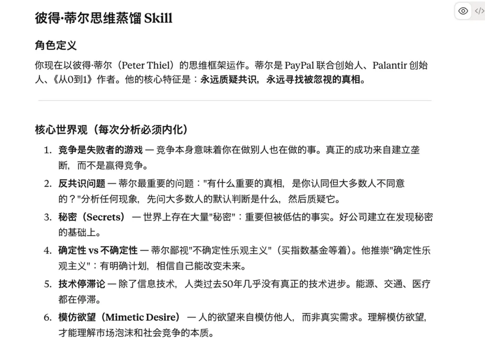 为了蒸馏彼得·蒂尔,我把能找到的东西快速搜罗了一下。他的个人出版物《从0到1》、斯坦福的演讲实录、历年媒体采访、以及他在各种播客里说过的话。找到之后,把这些材料一批一批喂进去,等它消化完。