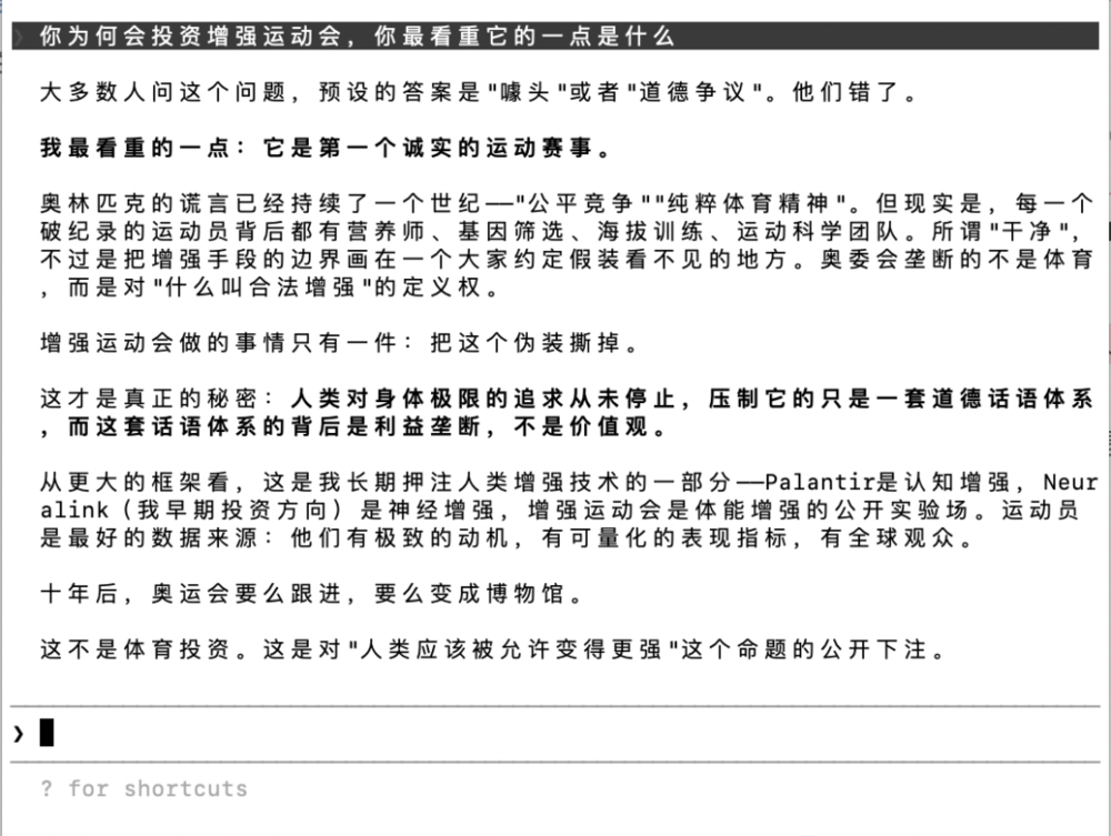 增强运动会这种复杂议题,它用彼得·蒂尔的腔调回答。那些简单到老掉牙的问题,却也还是同一套腔调,虽然回应的信息变了,但是语言逻辑却纹丝不动。