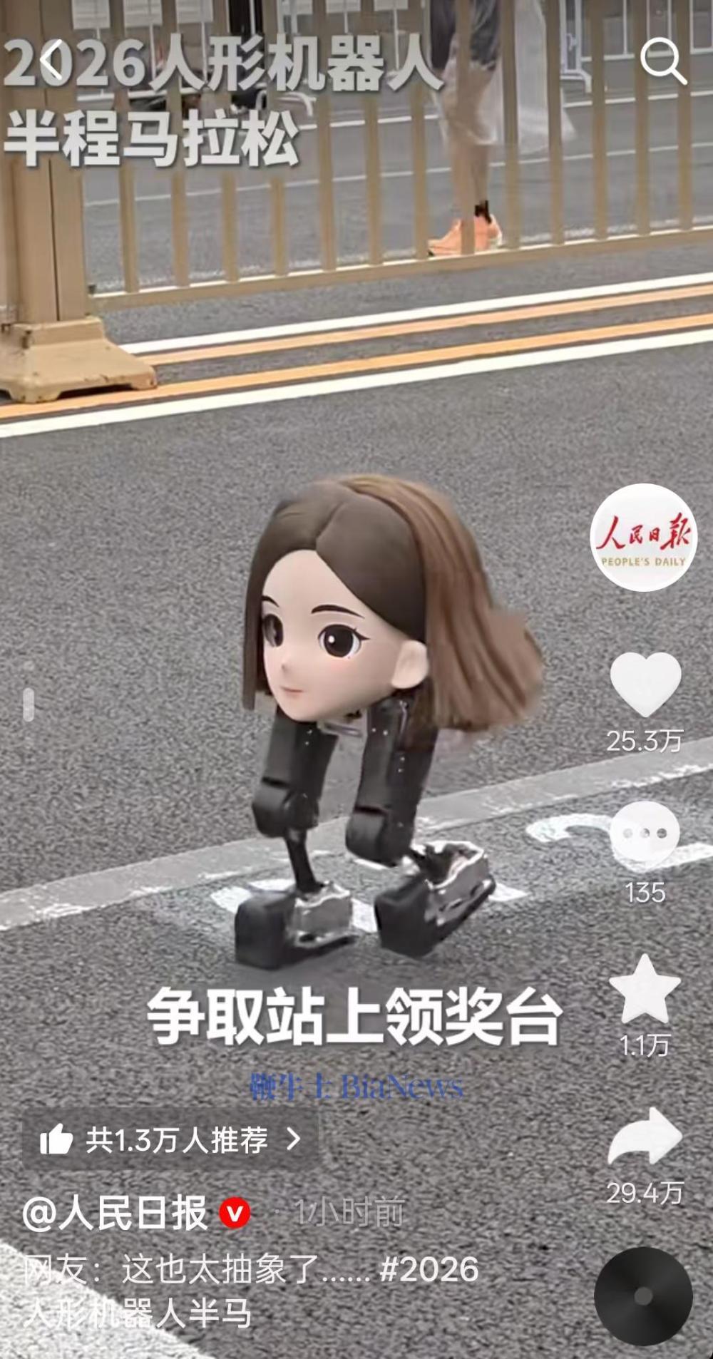 相关画面被网友拍摄后发布至社交媒体平台,“豆包机器人跑半马”话题迅速冲上热榜。