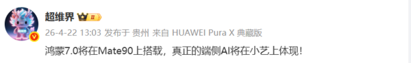 【CNMO科技消息】4月22日,数码博主“超维界”透露,鸿蒙操作系统 7.0将在华为Mate90上搭载,真正的端侧AI将在小艺上体现!