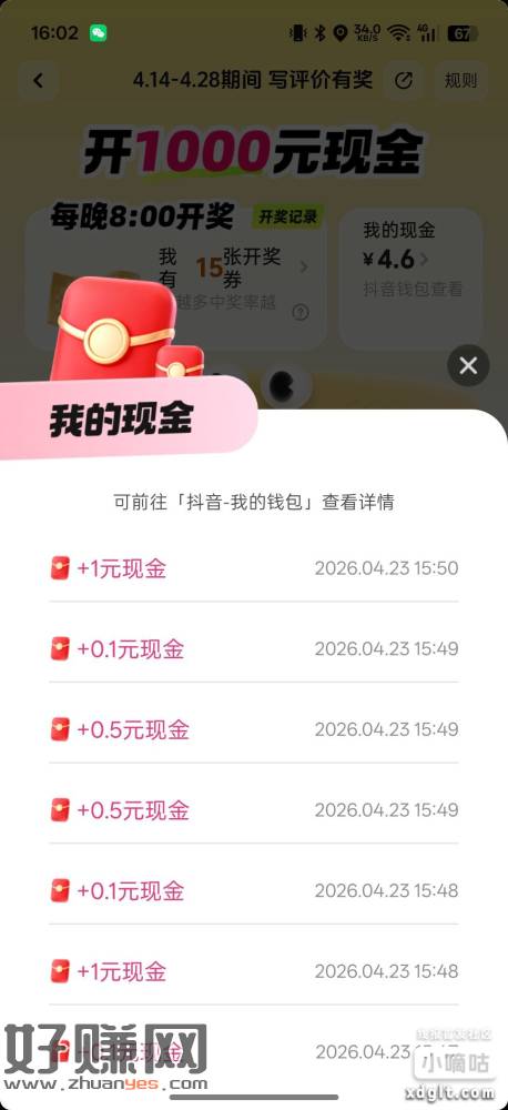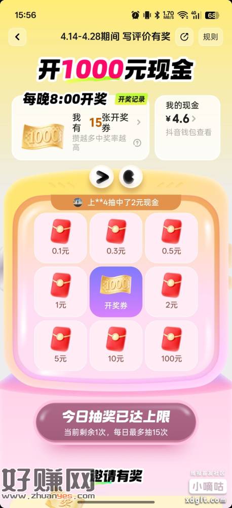 dy刚发现的羊毛,看图操作,写评价15字抽奖,看运气得现金红包,一天15次,我搞了4块多,随便写什么都行,不要重复写一段话,否则不给抽奖机会