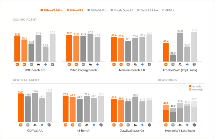最长支持100万token上下文,agent性能超过上一代MiMo-V2-Pro。在自家MiMo Coding Bench上,MiMo-V2.5达到接近Pro级体验,但成本只要一半。