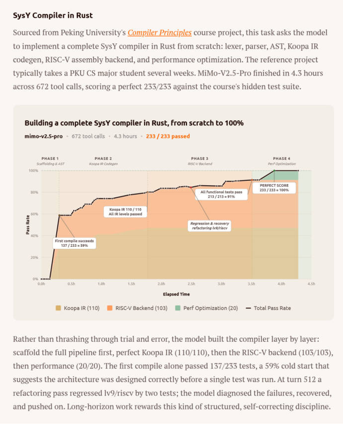 参考项目通常需要北大计算机专业学生花费数周时间。MiMo-V2.5-Pro在隐藏测试集上拿到了233/233的满分。