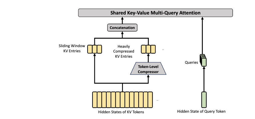 为了避免压缩损失局部细节,两种注意力都额外引入了滑动窗口分支,让每个 token 能完整看到最近的若干个相邻 token。
