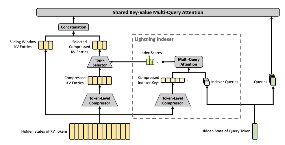 CSA 里还有一个闪电索引器,用 FP4 低精度快速算出每个查询 token 和各压缩块之间的相关性得分,再挑出 top-k 个块参与后续注意力,进一步压缩计算量。