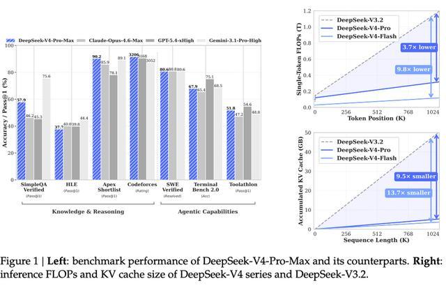 从官方给出的数据来看,在100万token上下文下,DeepSeek-V4-Pro单token推理TFLOPs相比DeepSeek-V3.2下降约3.7倍至9.8倍区间,KV Cache占用下降9.5倍至13.7倍。