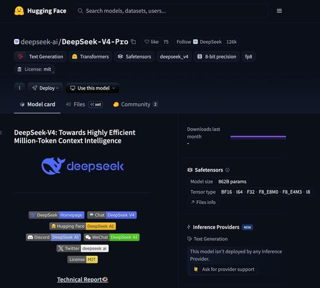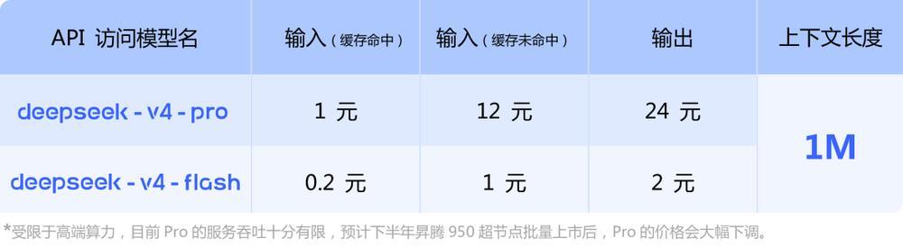 同时,官方公布了DeepSeek-V4系列的API定价:DeepSeek-V4-Pro在输入命中缓存的情况下为1元/百万tokens,输入未命中缓存则为12元/百万tokens,输出为24元/百万tokens;DeepSeek-V4-Flash在输入命中缓存仅0.2元/百万tokens,未命中输入1元/百万tokens,输出2元/百万tokens。