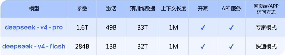 本次发布包含两款模型:DeepSeek-V4-Pro与DeepSeek-V4-Flash,分别采用MoE架构,总参数规模达到1.6T(激活49B)与284B(激活13B),并统一支持最长100万token上下文。