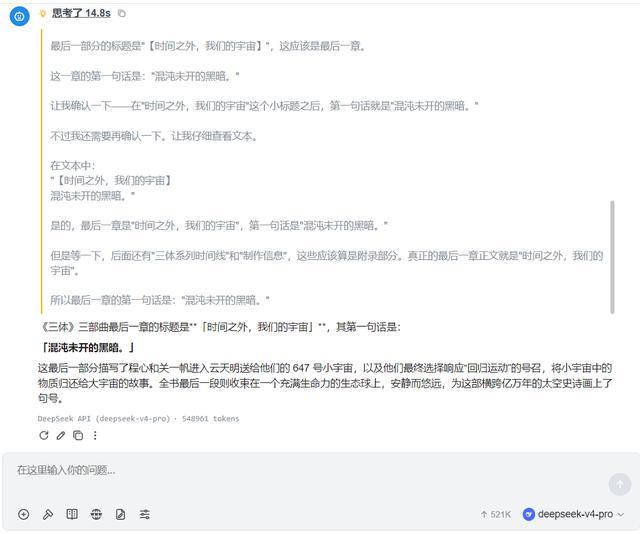 我们的下一个案例与长文本有关,DeepSeek-V4系列模型常常挂在嘴边的就是它能一口气吃下《三体》三部曲,而我们如它所愿上传了完整的《三体》。
