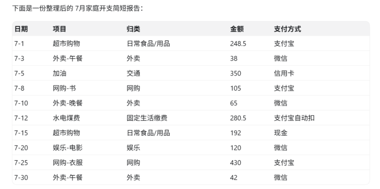 这个测试场景设计得虽然简单,却很能看出AI是否真的“好用”。因为家庭记账是很多人的日常,但记录常常是随手写、格式乱,“乱七八糟”的记账数据要求AI不能只会处理整齐的表格,还得能“看懂”手写式的记录、理解每笔钱是什么意思,并把相似项目归到一起。