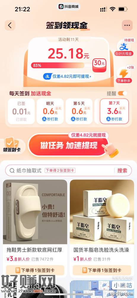 抖音商城,首页,签到领现金,还有几天应该就有30元了