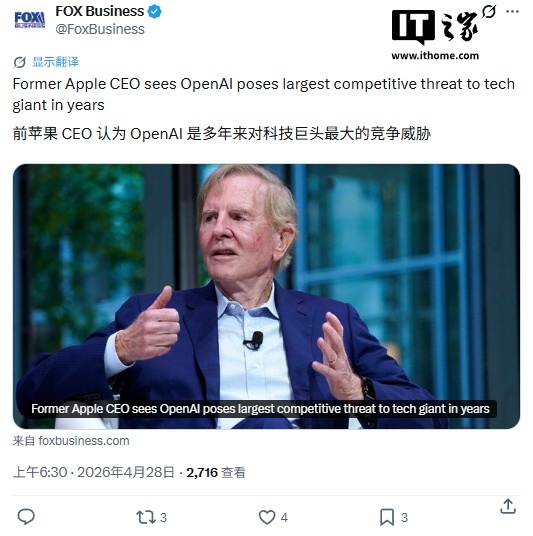 IT之家 4 月 28 日消息,约翰 · 斯卡利(John Sculley,1983 至 1993 年任苹果 CEO)在接受福克斯商业频道采访时表示,OpenAI 是苹果多年来面临的最大竞争威胁,这可能标志着苹果在科技行业长达数十年主导地位出现转折。