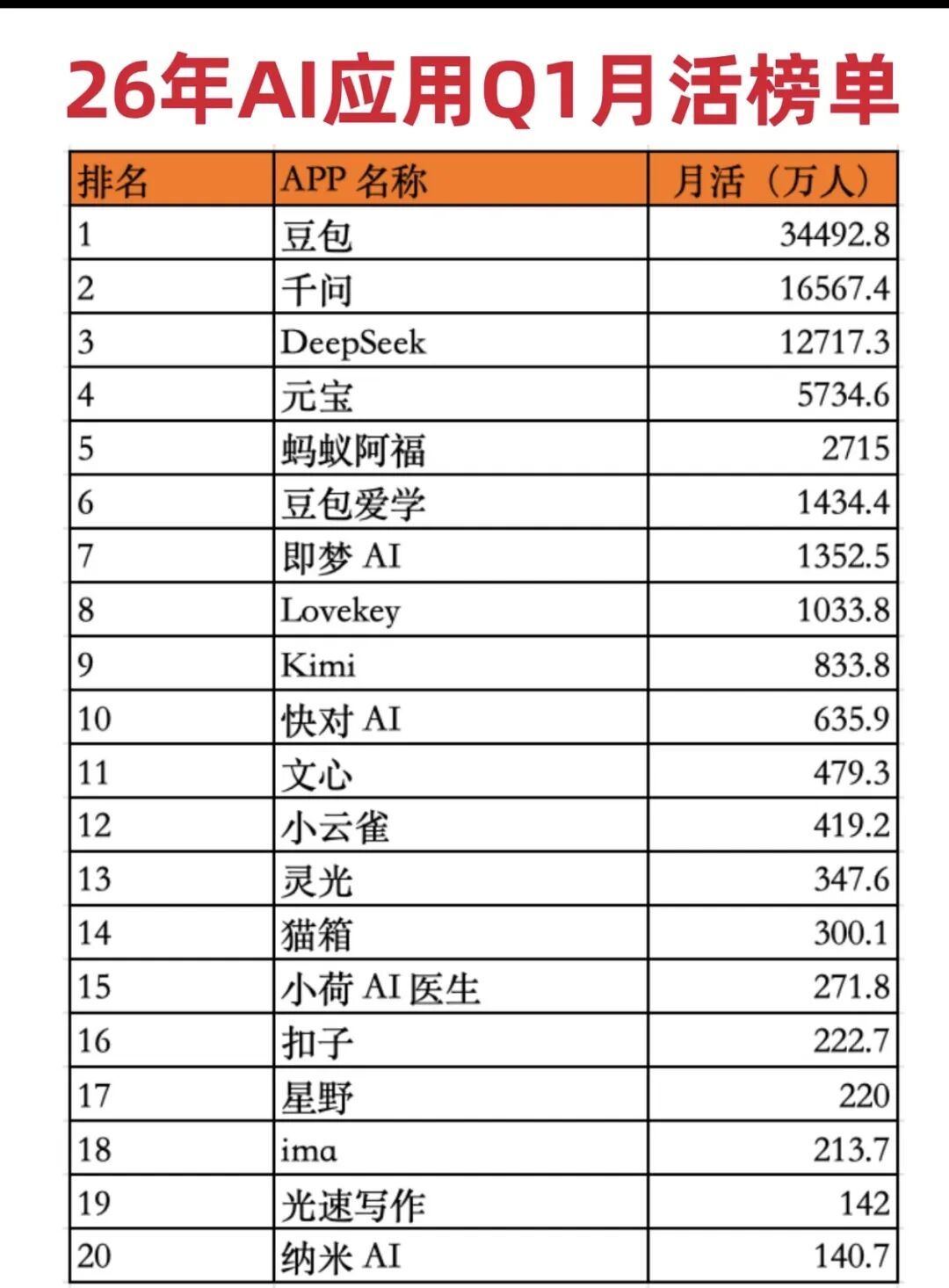 DeepSeek是另一个例子。R1之后,DeepSeek成为“实用主义AI”的代表,靠深度思考和低门槛体验拿到庞大C端用户。QuestMobile显示,DeepSeek 2026年3月月活仍有1.27亿,在国内AI原生App中排名第三。
