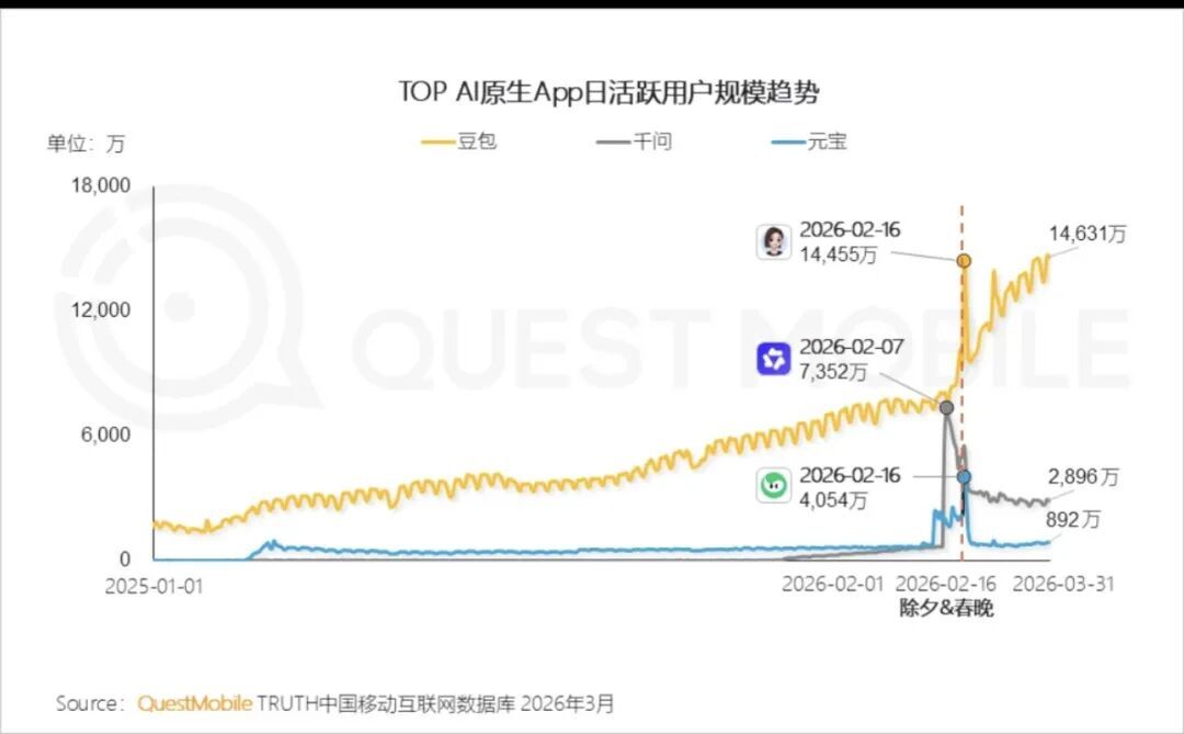 QuestMobile最新数据显示:截至今年3月,AI原生App月活规模已达4.4亿,豆包、千问、DeepSeek分列前三,月活分别为3.45亿、1.66亿、1.27亿。