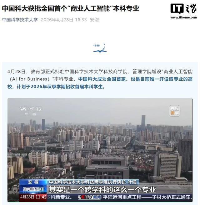IT之家 4 月 29 日消息,教育部 4 月 28 日正式批准中国科学技术大学(中国科大)科技商学院、管理学院增设“商业人工智能(AI for Business)”本科专业。
