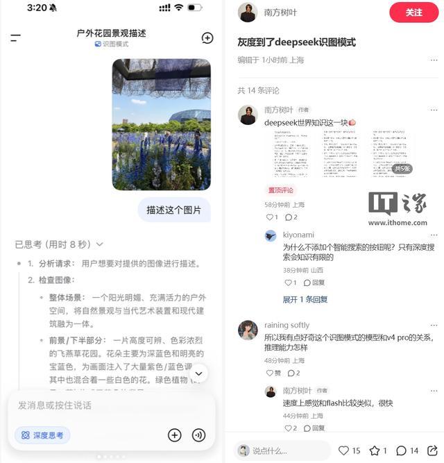 根据网友今日晒出的图片,灰度到的用户可以上传一张图片,让 DeepSeek 描述这张图。有网友称“速度上感觉和 flash 比较类似,很快”。