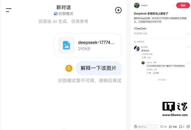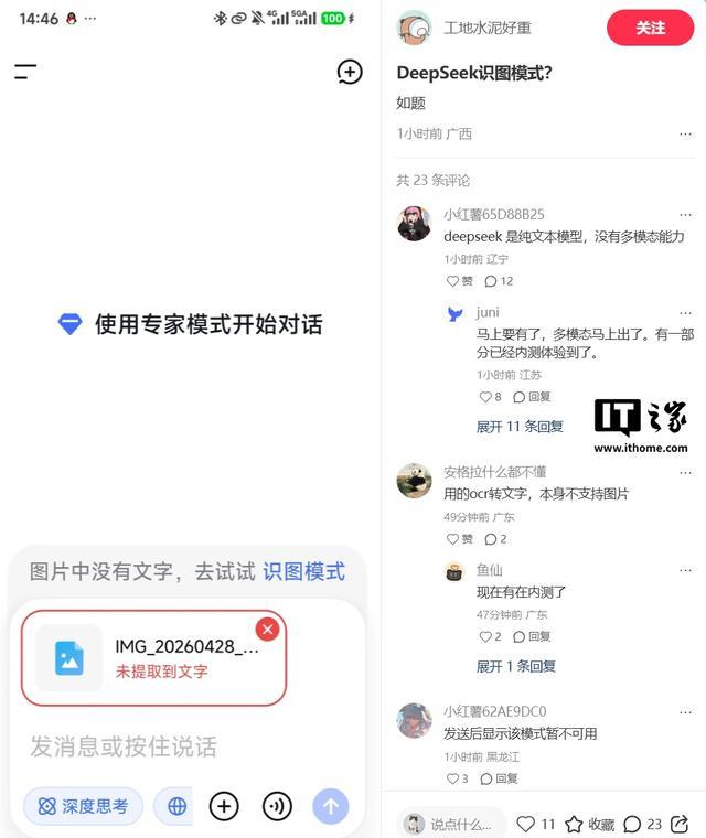 IT之家 4 月 29 日消息,据IT之家小伙伴反馈,DeepSeek 正在灰度测试“识图模式”,该模式和“快速模式”“专家模式”并列,并非简单的 OCR 文字,而是终于具备了多模态识别能力。