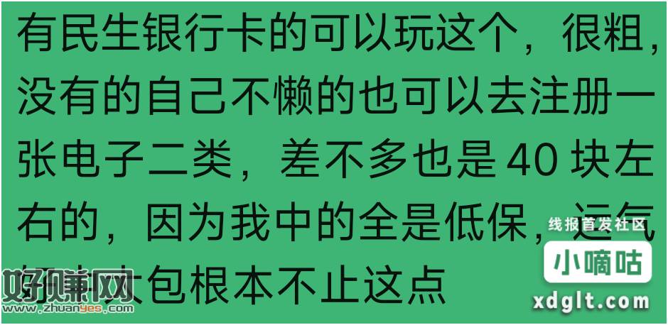 民生银行40+ 我中的全是低保的规则写的仅限实体卡,实际电子二类也可以玩,我没有实体,我的是电子二类http://www.cmbc.com.cn/market/Op ... TYPE=2&LOGIN_FLAG=1