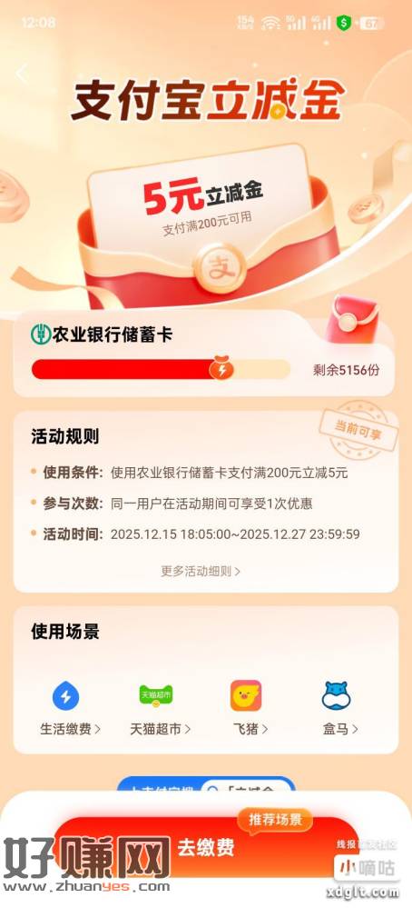 支付宝缴费电费满200–5,不知是不是广东地区活动,限制卡号。