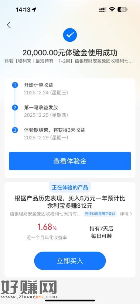 zfb会员中心搜:体验金兑稳利宝2~3w 体验3天部分人无忽略去拿,没有就切号看看有的话据说到期有5-10亓