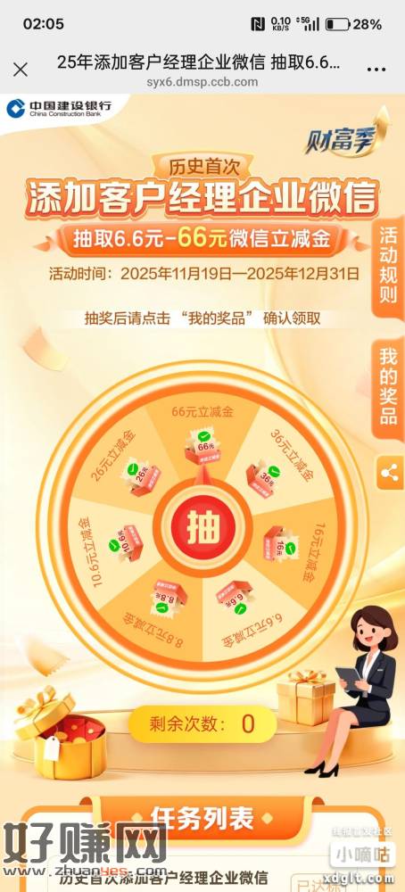 建hang造福季,好礼活动里添加客户经理企业微信可以抽奖,刚中8.8
